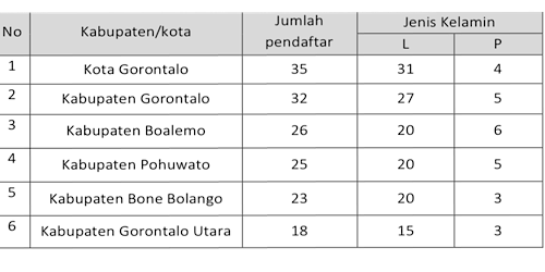 Sebelumnya, bahwa Tim Seleksi Calon Anggota Bawaslu Kabupaten/Kota Se-Provinsi Gorontalo pada tanggal 29 Mei s.d. 7 Juni telah melaksanakan tahapan Penerimaan Bakal Calon Bawaslu Kabupaten/Kota dengan hasil pendaftaran sebagai berikut :