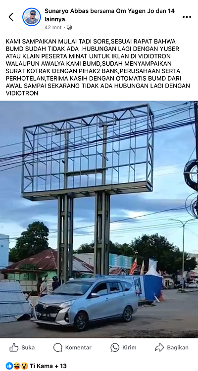 “Kami sampaikan mulai tadi sore, sesuai rapat bahwa BUMD sudah tidak ada hubungan lagi dengan user atau klien peserta minat untuk iklan di videotron,” tulis Sunaryo Abas di unggahan Facebook dengan akun @Sunaryo Abbas.